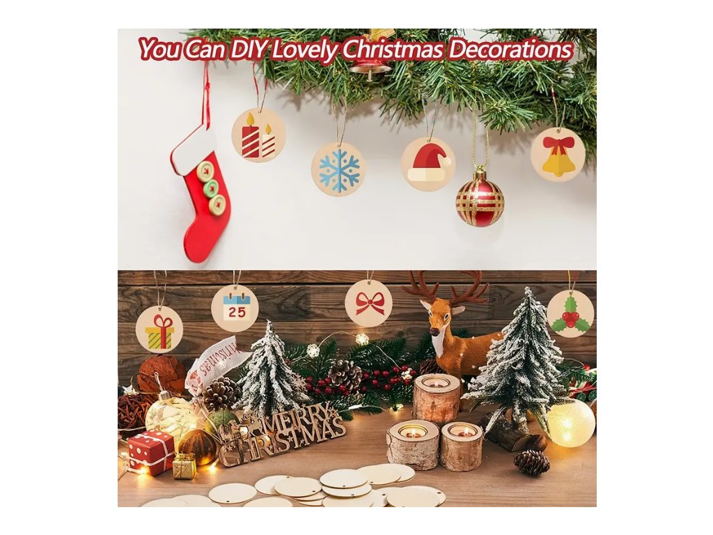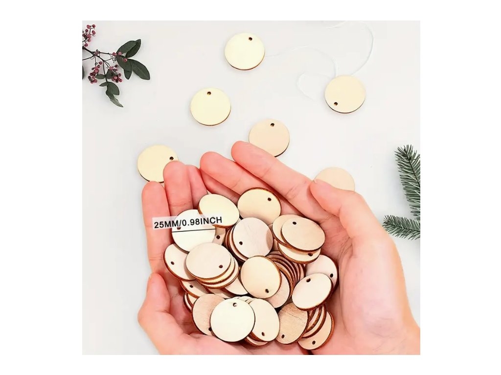25 mm átmérőjű felakasztható natúr fa korong kreatív dekorációk készítéséhez. A középen található lyuknak köszönhetően könnyen felakasztható, festhető, gravírozható vagy díszíthető. Ideális DIY projektekhez, karácsonyfadíszekhez, ajándékkísérőkhöz vagy kreatív kézműves alkotásokhoz.